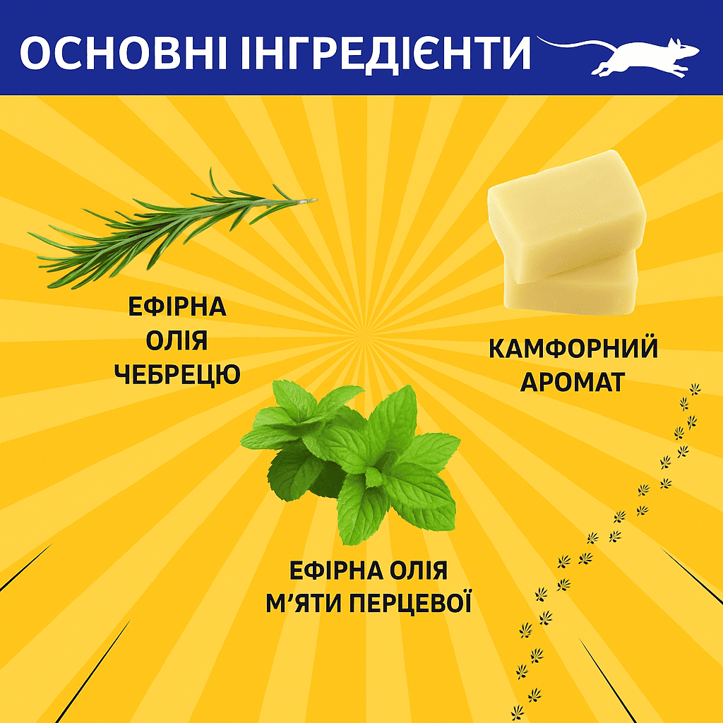 ✅ Формула на основі натуральної м’ятної олії — створює неприємну для гризунів атмосферу й відлякує їх ефективно. ✅ Створює невидимий ароматичний бар’єр навколо точок входу, що перешкоджає проникненню та затриманню шкідників. ✅ Запобігає укладанню гнізд та хованкам — обробка тріщин, щілин і темних кутків робить їх непридатними для гризунів. ✅ Запобігає жуванню та гризінню — аромат дисциплінує поведінку гризунів, захищаючи дроти, меблі та інше майно. ✅ Безпечний та екологічний вибір — формула не містить агресивних хімікатів, підходить для домівок з дітьми і домашніми улюбленцями.