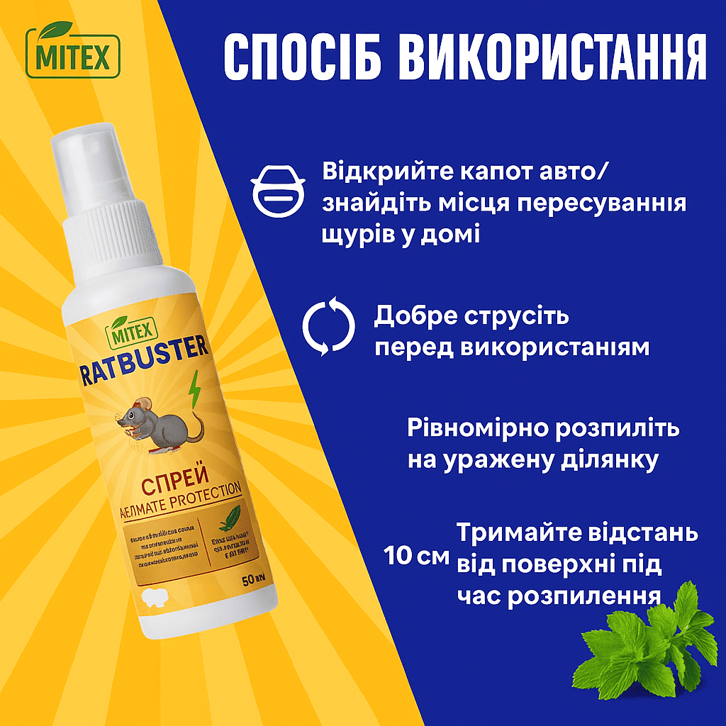 Шукаєте ефективний спосіб позбутися гризунів у домі? Представляємо вам універсальний засіб — наш спрей, створений на основі натуральної м’ятної олії — він діє точно в тих зонах, де гризуни зустрічаються найчастіше. Формула націлена на створення ароматичного бар’єру: гризуни уникають оброблених ділянок, бо запах для них — справжній сигнал тривоги. Обробка тріщин, щілин, моторного відсіку авто та інших потенційних місць проживання гризунів дозволяє позбутися їх активності й захистити своє майно. І все це — без агресивної хімії: безпечний для дітей, домашніх улюбленців і самого простору.